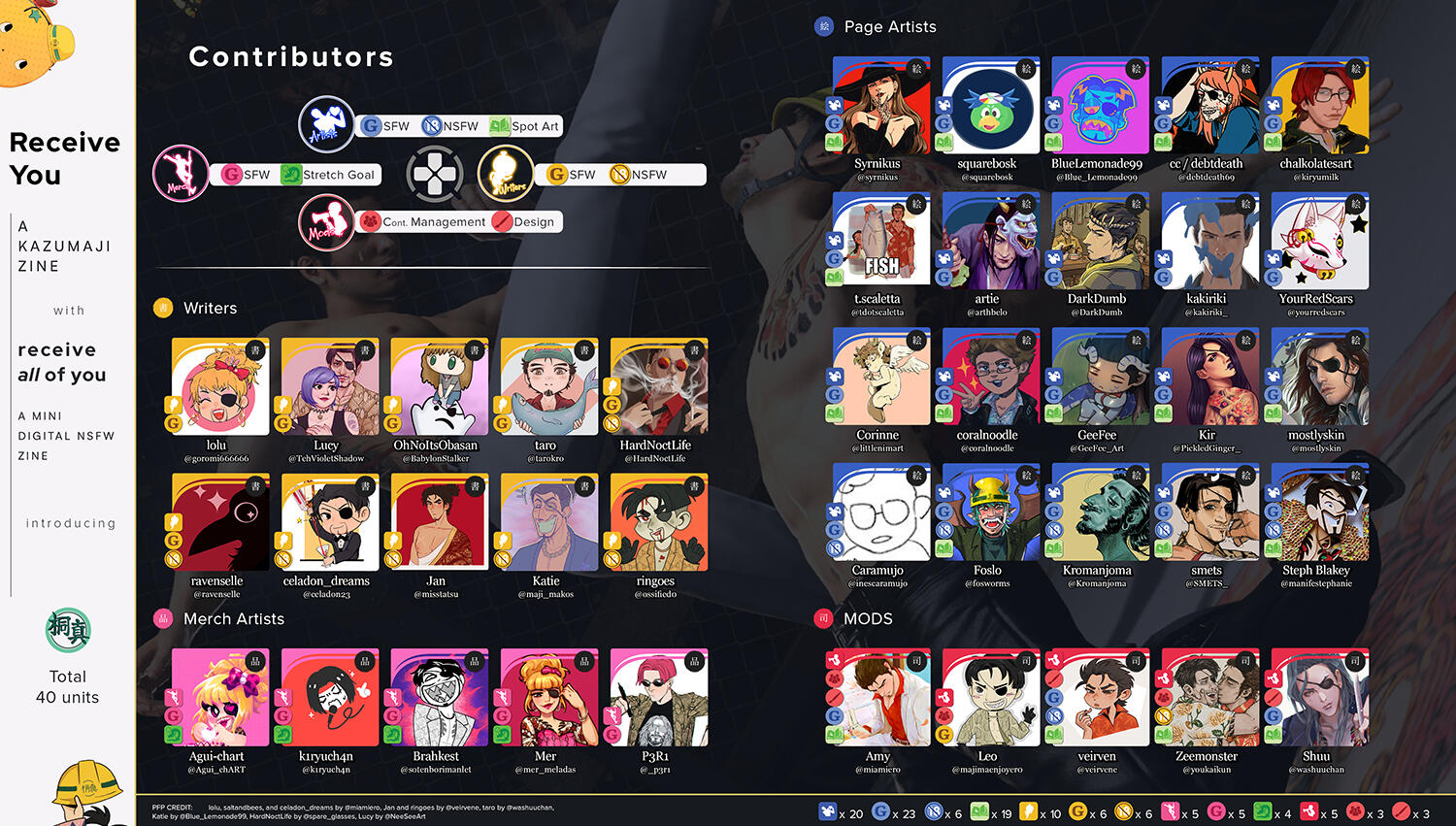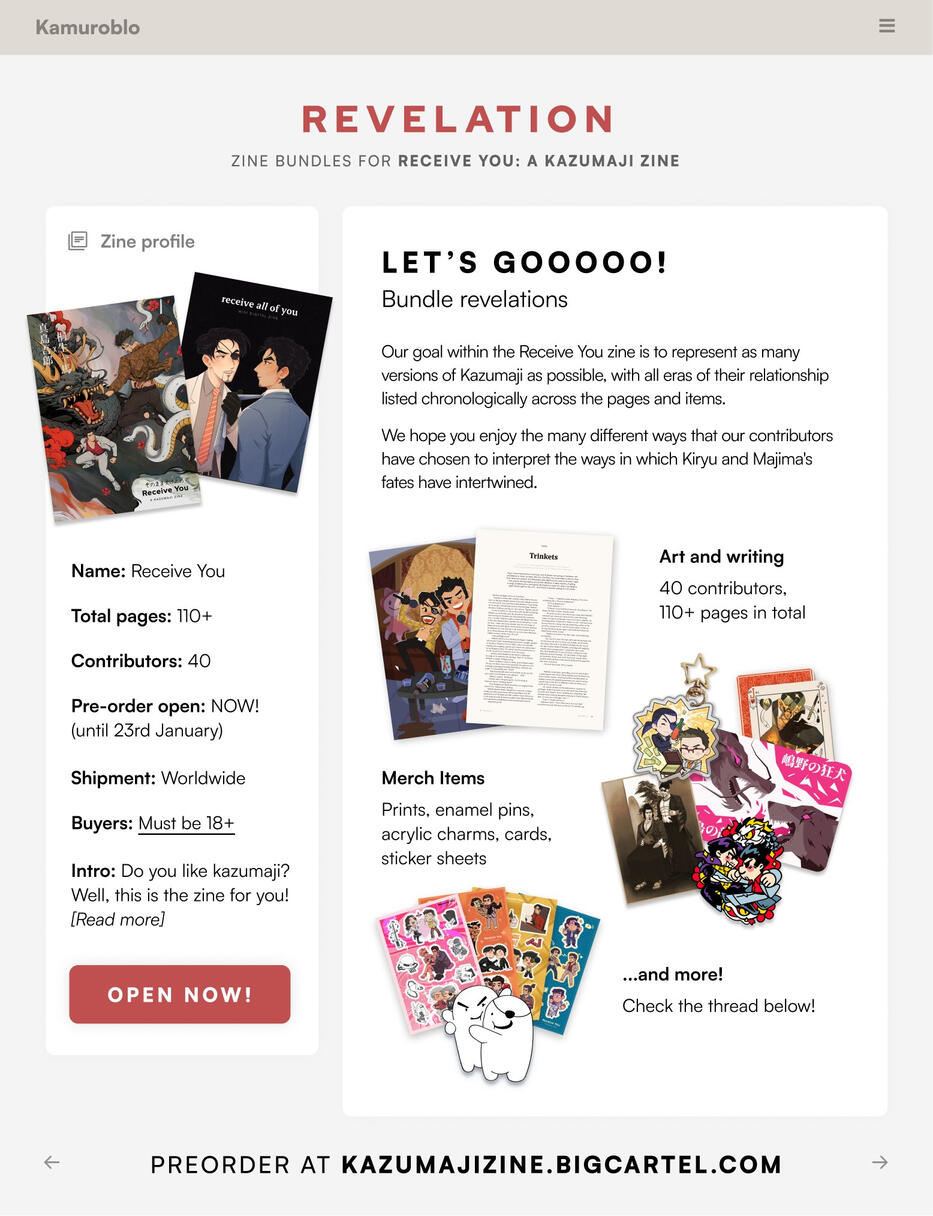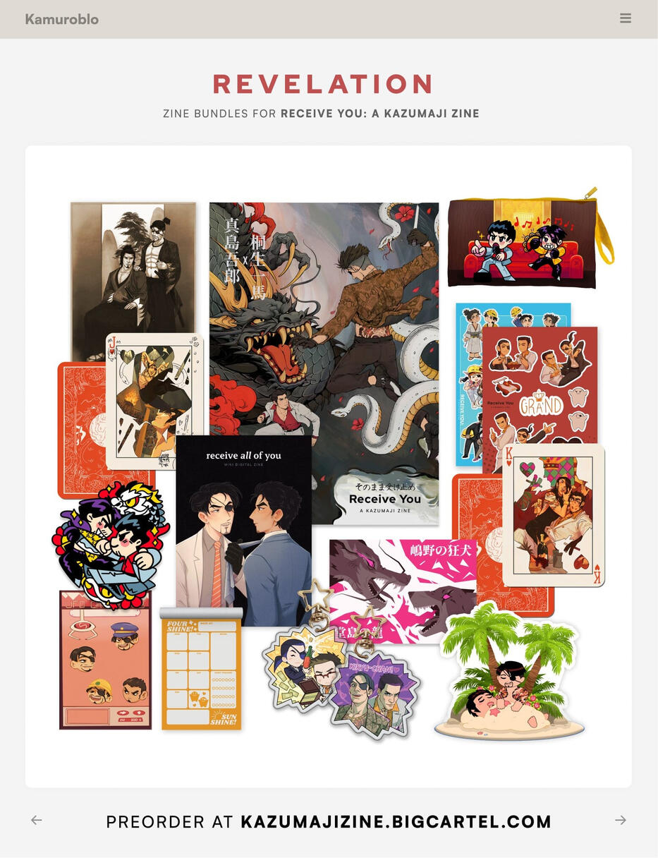 Receive You: A Kazumaji Zine is a collaborative fanzine from 40 contributors around the world, meant to celebrate on the ship between Kiryu Kazuma and Majima Goro from the Ryu Ga Gotoku franchise.
